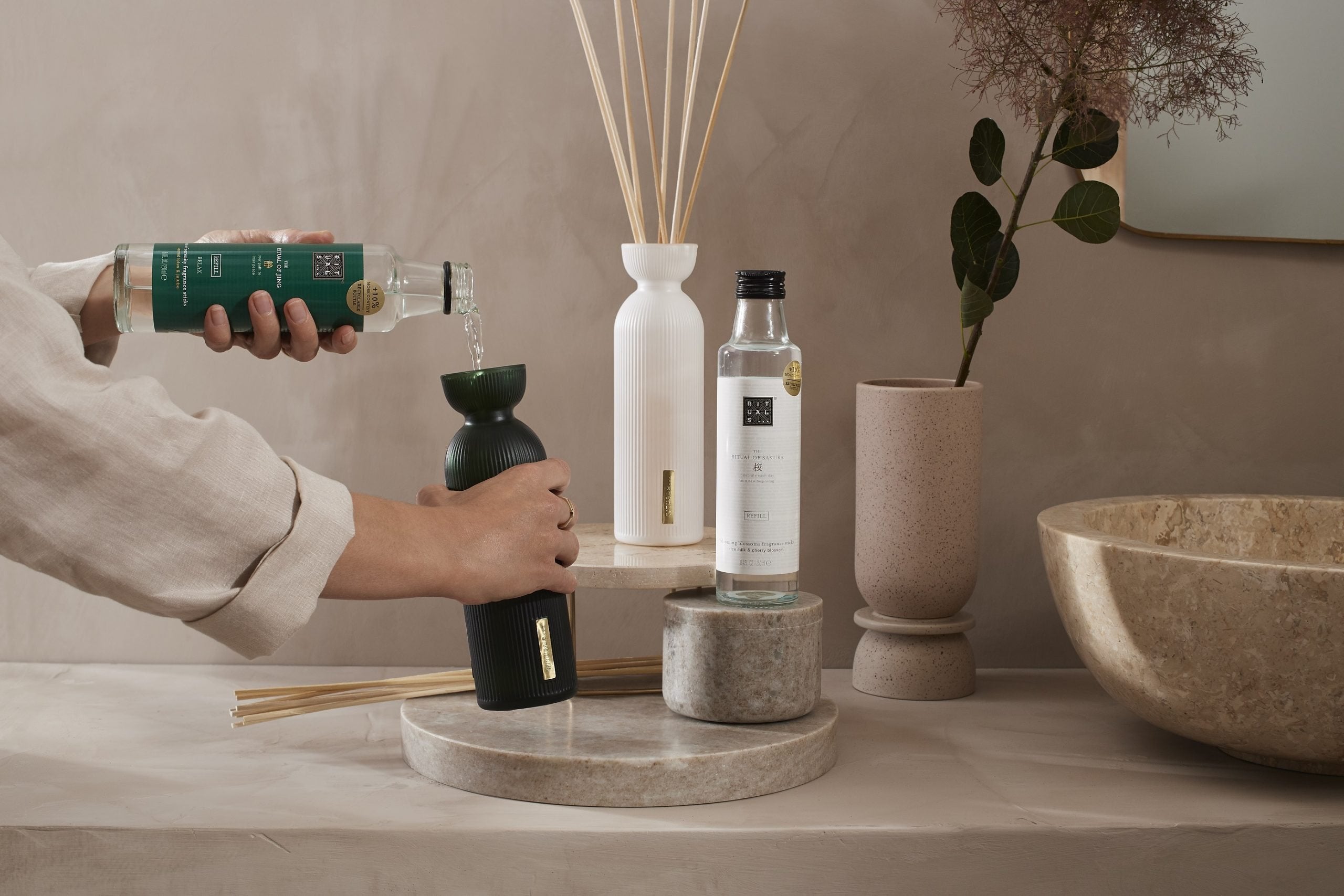 The refill lasts around 3 months. Tip: for an additional fragrance experience, you can combine the diffuser with The Ritual of Jing scented candle